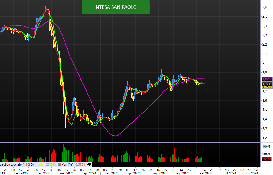 Ad esempio il grafico di Intesa che ha invertito la rotta con un calo lento, ma continuo. In perfetta sintonia con l'indice europeo.