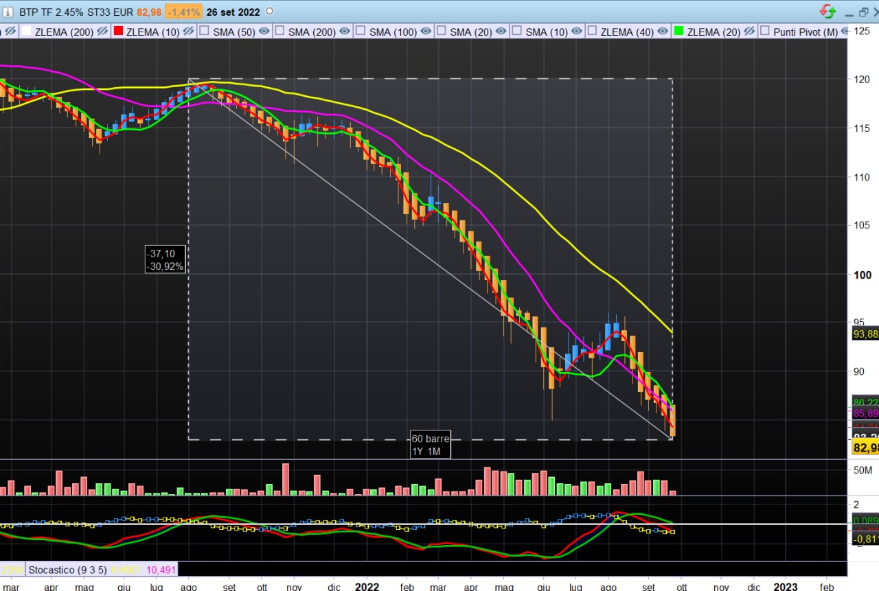 Il BTP scadenza 2033 ha perso il 31% in un anno e non è finita. E, inoltre, tutti i BTP hanno perso. Il debito è eccessivo. L'aumento dei tassi e del costo del debito stesso nonchè la riduzione delle entrate fiscali unite all'aumento della spesa pubblica lo rendono insostenibile. L'Italia è troppo grande per essere salvata e nessuno pagherà il nostro debito se non gli italiani.