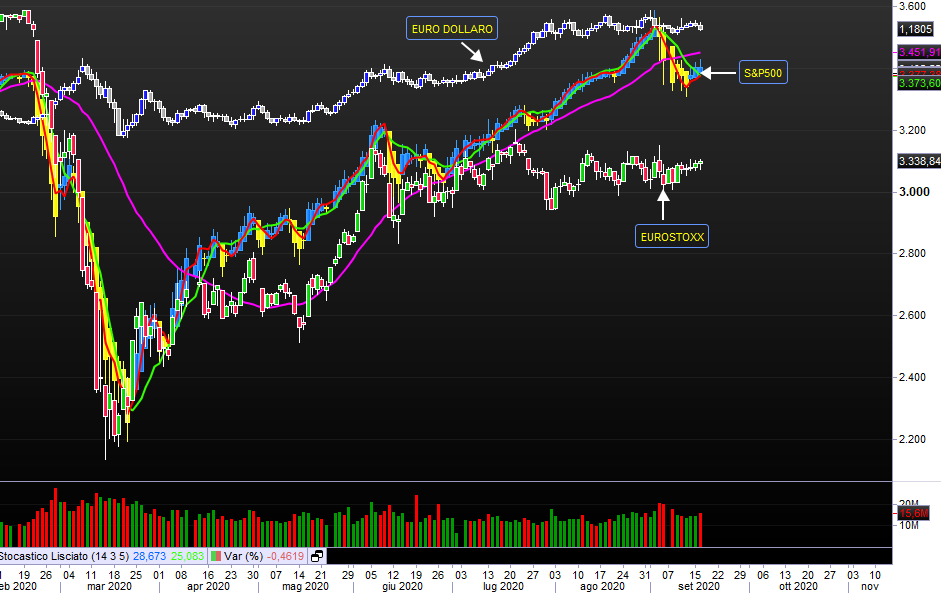 Il grande crollo, il recupero insperato e poi da giugno un rilassaeno e l'inizio di una fase laterale. Be visibile sull'Europa e su tutti i suoi indici rapprentato nel grafico dall'Eurostoxx. Meno visibile sullo S&P500 perchè è visibile una salita compensata però dal calo del dollaro.