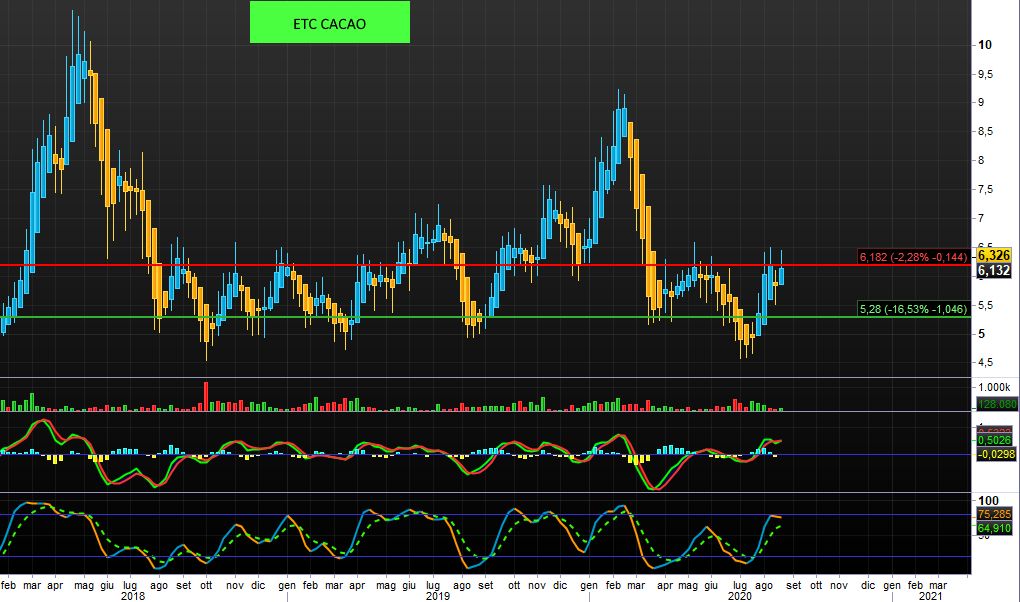 Il cacao è ripartito. L'Etc con leva 2 sul cacao ha affrontato la resistenza a 6,18 e il suo superamento potrebbe proiettarlo fino a 8,8 euro.