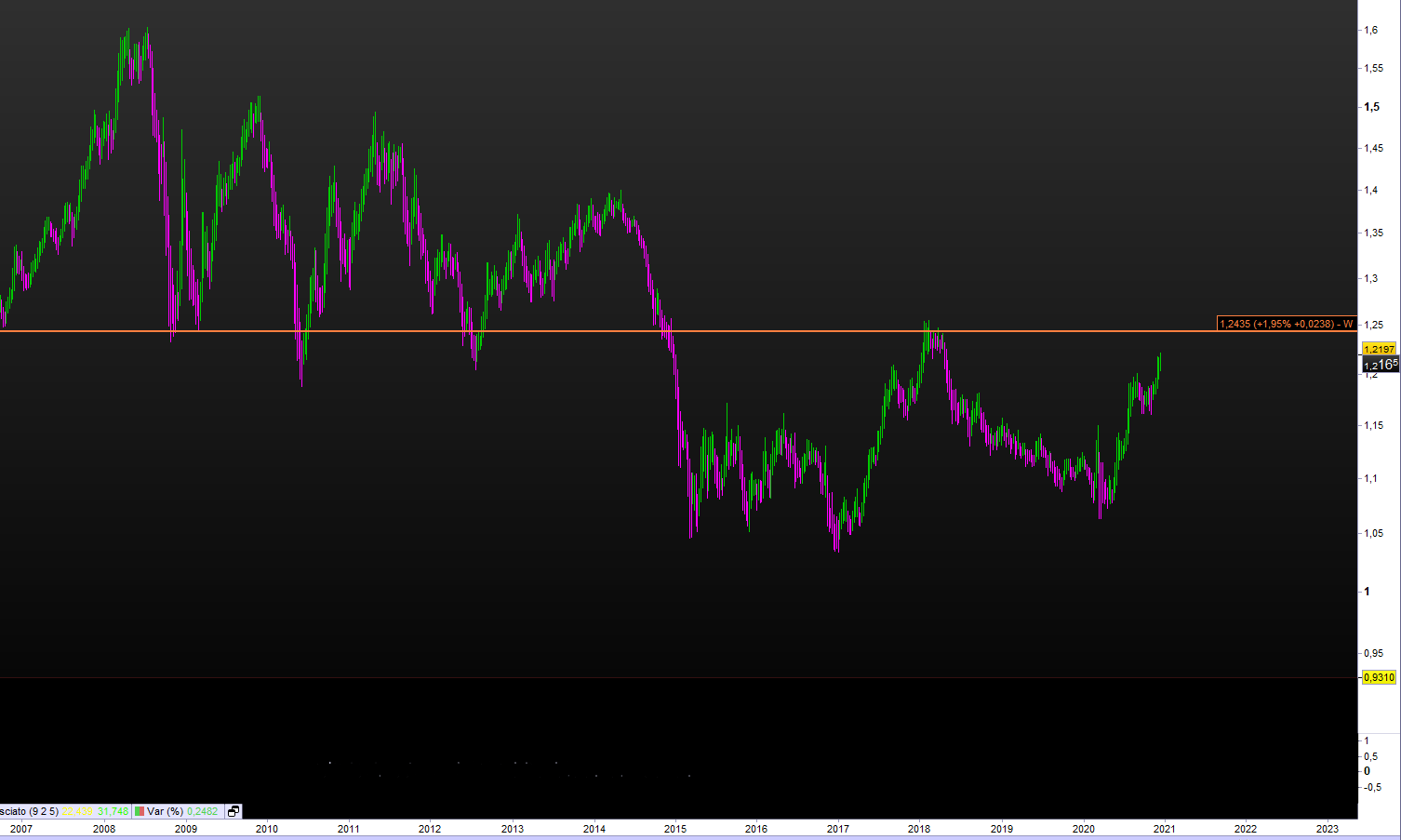 Ma non ci dovremo stupire se superasse anche questo ostacolo e ci ritroveremmo un dollaro su valori che non si vedevano da circa 6-7 anni.