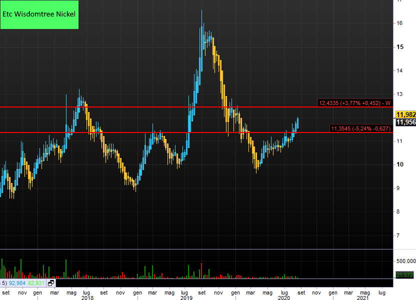 Dopo una breve pausa a 10,70 l'Etf sul nickel è ripartito e ha superato di slancio la resistenza posta a 11,35 e oggi viaggia oltre i 12 euro; esattamente a 12,14. Il guadagno è del 13,5%