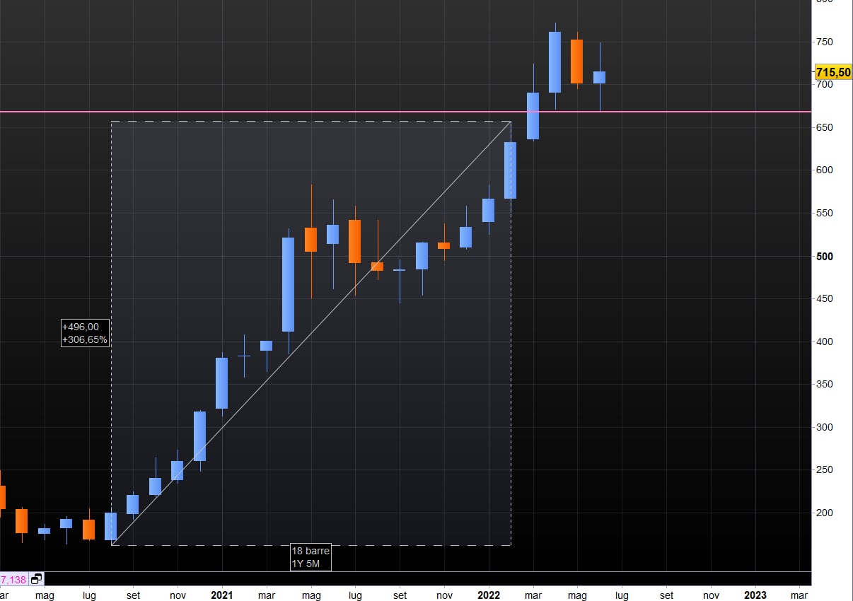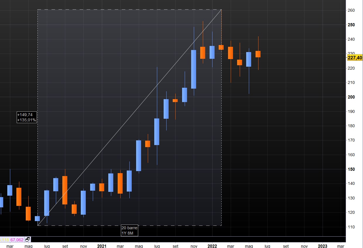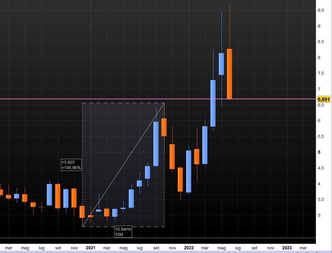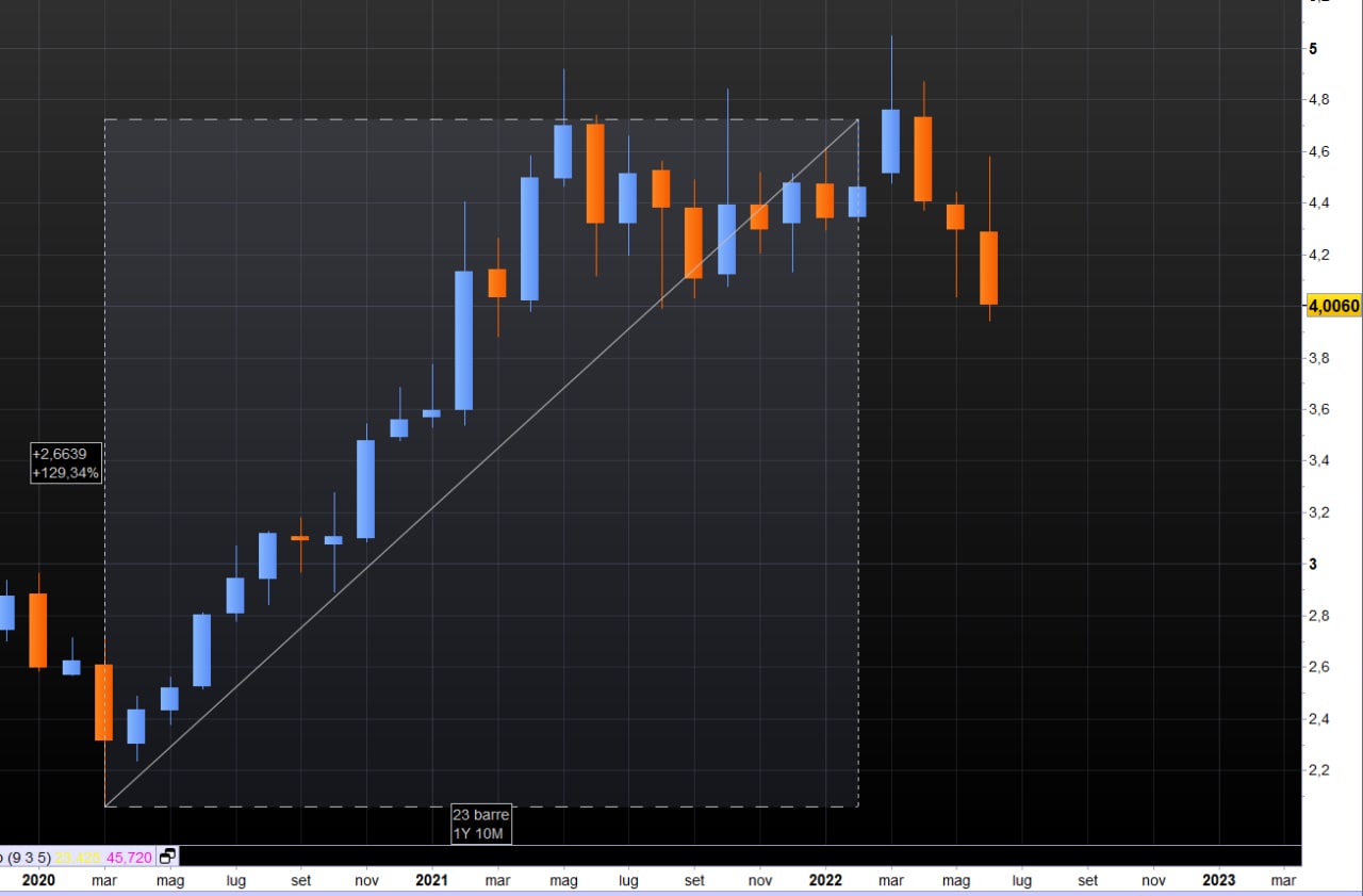 Quello sopra esposto è il grafico del rame, come si può vedere il valore prima della guerra era già cresciuto del 129%. Addirittura, oggi, è il 16% in meno rispetto all'inizio della guerra.