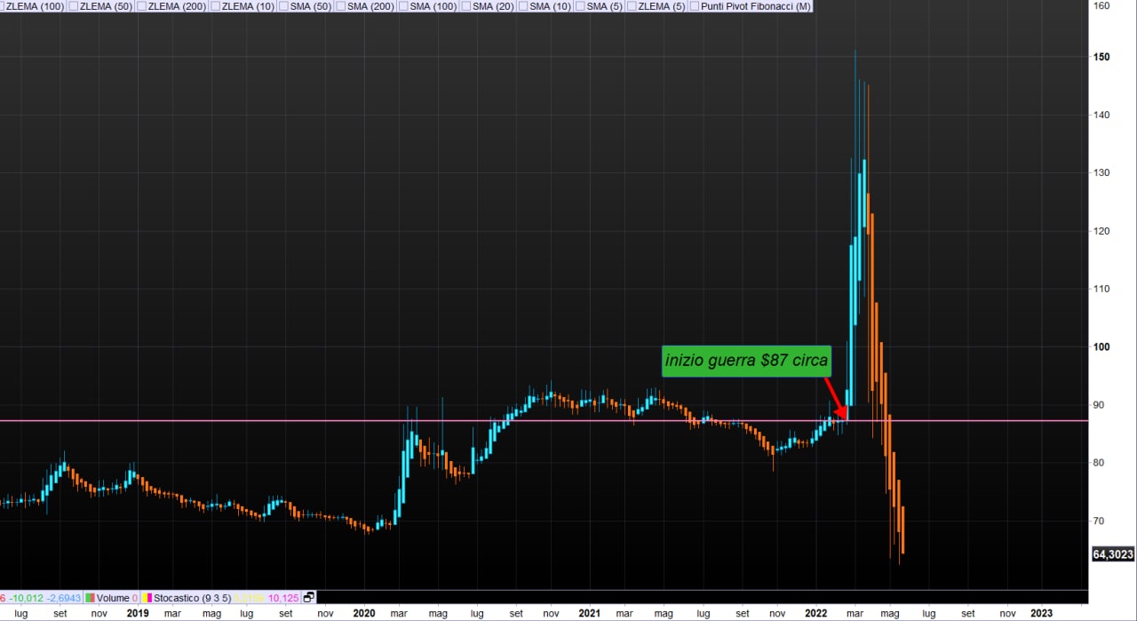 Ed è così che, quasi immediatamente, è cominciata la risalita della valuta di Putin in modo portentoso. Nel grafico risalta la pendenza del recupero visibile nelle candele arancioni che denotano la velocità con la quale è risalita. Mentre scrivo siamo a 58 rispetto al massimo di 150 un recupero del 62% e rispetto all'inizio della guerra siamo vicini al 34%.